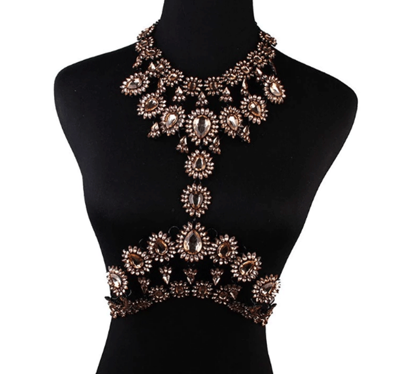 Fashion Hot Sale Crystal Ornament Custom Bikini Gypsy Top Harness Triangle Bra Body Chest Chain Necklace Jewelry